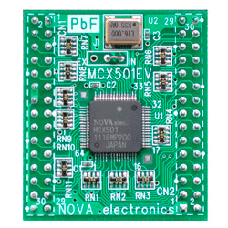 MCX501EV-MCX501評価用モジュール MCX501を基板に実装した評価用モジュールです。16MHzの水晶発振器を実装しています。 ICの入出力信号は、CLK信号を除き、裏面に実装された2個の2.54ピッチ30ピンコネクタの端子に、それぞれ配線されています。