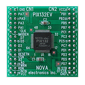 PIX132EV-PIX132評価用モジュール PIX132を基板に実装した評価用モジュールです。ICのすべての入出力信号は、裏面に実装された2個の2.54ピッチ30ピンコネクタの端子に、それぞれ配線されています。