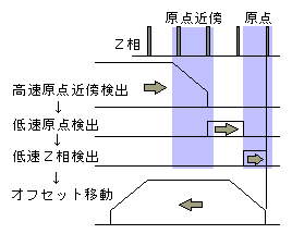高速原点近傍検出 → 低速原点検出 → エンコーダZ相検出 → 偏差カウンタクリア出力 → オフセット移動 → 位置カウンタクリアの一連の検出動作を全自動化
