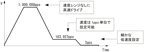 本ICは速度レンジフリーでこのような不便さを解消し、ドライブ中に1pps、2ppsのような低速から1Mppsのような高速パルスへダイレクトに速度変更をさせることが可能です。