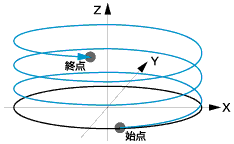 従来の直線・円弧補間に加え、XY平面における円弧補間ドライブに同期して他の軸を移動させるヘリカル補間ドライブの実行が可能です。左図は複数回転の例を示しています。
