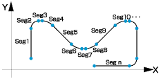高速の連続補間ドライブに対応するために、各セグメントの終点データを蓄える8段のプリバッファレジスタを備えています。左図のSeg3のような短いセグメントが存在しても、Seg3を含む8個のセグメントの平均移動時間が次セグメント位置データセット時間より長ければ連続補間を行うことができます。