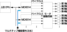 複数のMCX514を連結して、5軸以上の多軸直線補間を行うことができます。