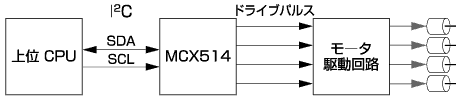 MCX514は上位CPUと8ビット、16ビットバスおよびI2Cシリアルインターフェイスバスで接続し、パルス列のサーボモータ、ステッピングモータを各軸独立の位置決め制御、 または速度制御ができる4軸モーションコントロールICです。