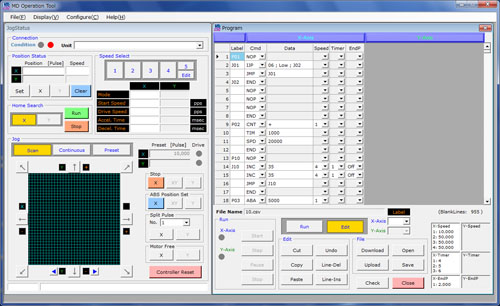 付属のMD5130D用操作ツールより各種動作パラメータと27種類の命令による最大1000ステップのユーザプログラムを登録することができ、複雑な動作を予め登録し簡単に実行することができます。ユーザプログラムはCSV形式で保存され、CSVでの編集も可能です。