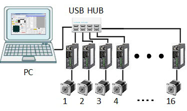 USBにてパソコンと接続し、最大16台まで接続できます。パソコンから操作ツールを使ってプログラムの書き込みや編集、各軸のマニュアル操作ができます。また、通信コマンドが別資料で用意されていますので、お客様が独自にパソコン上で組まれたVBやVCプログラムで直接本体を制御することも可能です。