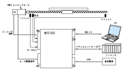 パラレルインターフェイスは、上位PLC (シ-ケンサ)などと接続し、任意位置データを指定の速度で、ドライブ起動できます。またスキャンドライブ、連続ドライブ、プログラム実行などを行なうことができます。