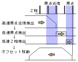高速原点近傍検出 → 低速原点検出 → エンコーダZ相検出 → 偏差カウンタクリア出力 → オフセット移動 → 位置カウンタクリアの一連の検出動作を全自動化