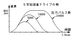 通常の直線加減速ドライブ(台形駆動)に加え、放物線 S字加減速ドライブが可能です。S字加減速ドライブは、右図に示すように、出力パルス数が少なくてもS字カーブを失わず、あくまでも滑らかです。