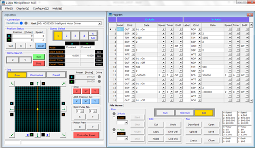 The user can register various driving parameters and the user program of up to 1000 steps by 36 kinds of commands. Thereby the complex operation can easily be performed by registering them in advance. MD5230D user program file is saved in the format of CSV file. The user can edit a user program file by using spreadsheet software applications